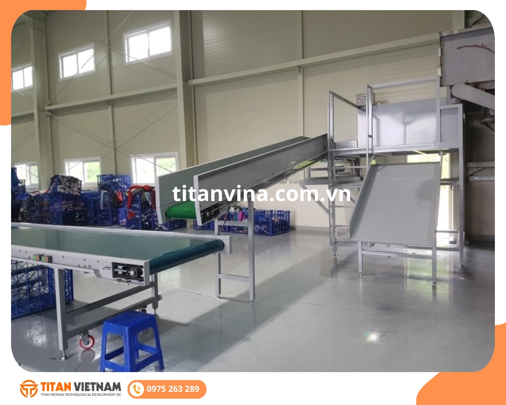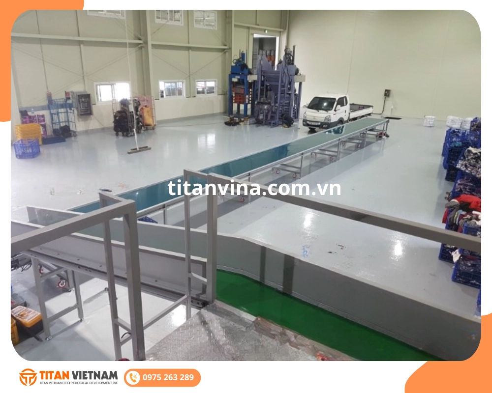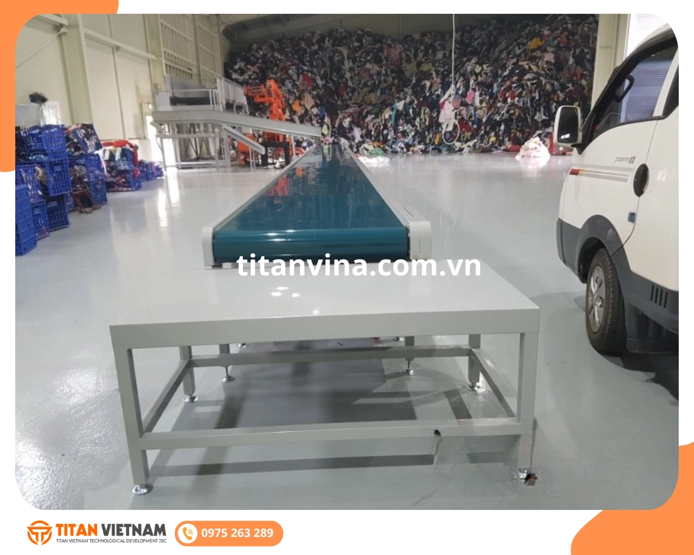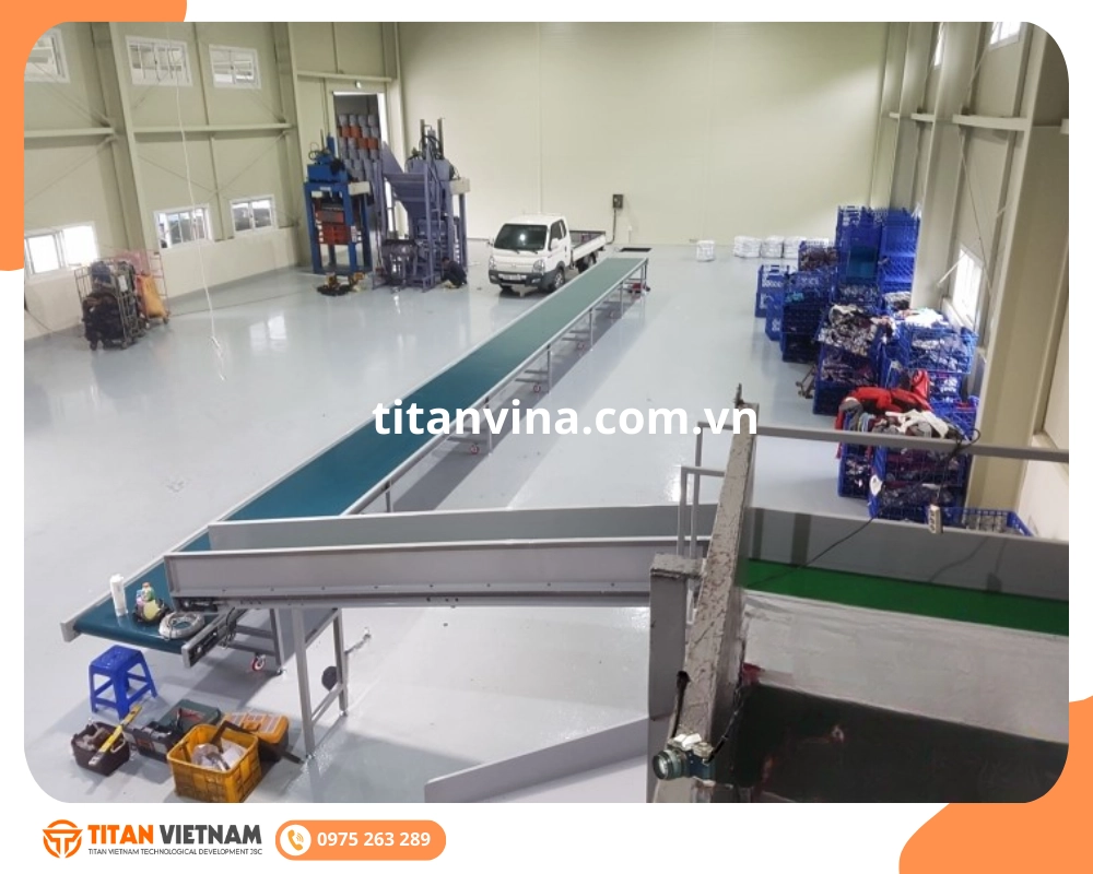 Băng tải hoạt động ổn định, ít tiếng ồn, phù hợp với môi trường làm việc trong nhà máy may mặc.